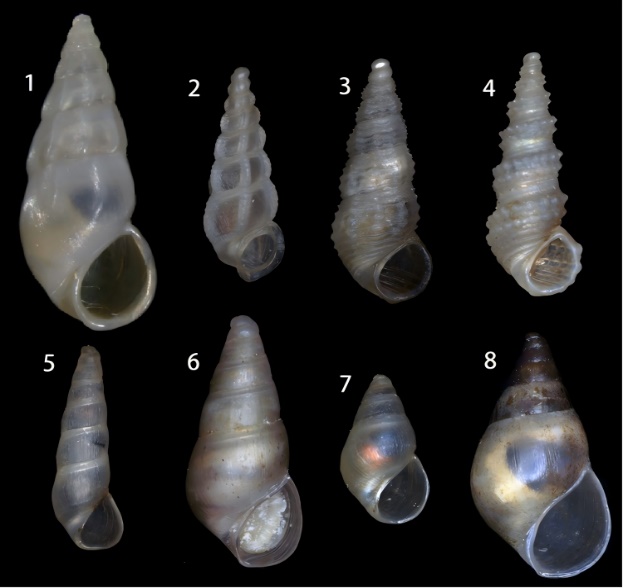 ▲1-8分别为玻璃昆明螺、铁锏昆明螺、流萤昆明螺、珍珠昆明螺、银匙远岸螺、大池远岸螺、冰糯远岸螺、俞元远岸螺