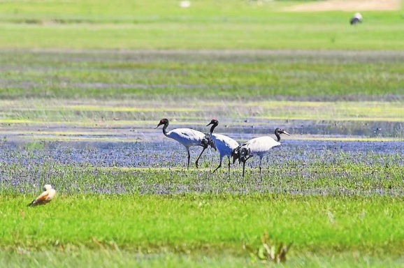 黑颈鹤在纳帕海湿地觅食。陈志明 摄