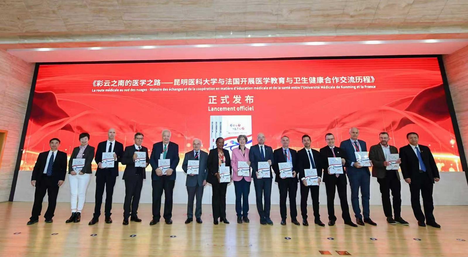 同时,记录滇法医学教育合作历程的专著《彩云之南的医学之路》在开幕式上正式发布。该书历时近两年编撰,以中、法、英三语呈现,收录五万余字与上百幅珍贵影像,系统梳理并展现了昆明医科大学与法国各界在医学教育领域的友好交往与丰硕成果,不仅具有重要的史料价值,也成为中法医学交流史上的一座里程碑。尹向阳和夏雪山向与会的中外嘉宾代表赠送书籍。