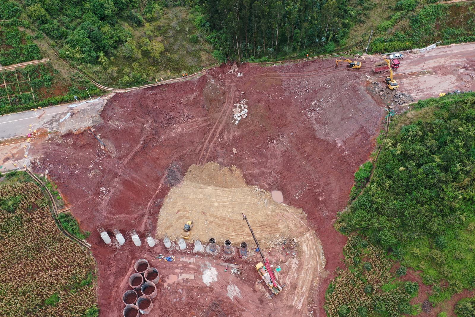 现场抢险施工负责人表示,目前主要施工任务是恢复路基及直径4米排水涵洞,现场打入了13根抗滑桩,在后期能起到加强支撑的作用,保障后期路基的稳定。“施工技术上的难度并不算大,只是雨季的干扰给施工带来了挑战,为了加快抢修进度,施工方投入40多台(套)机械设备、200多人进行抢险施工。预计将于12月底完成抢修施工,恢复道路通行。”