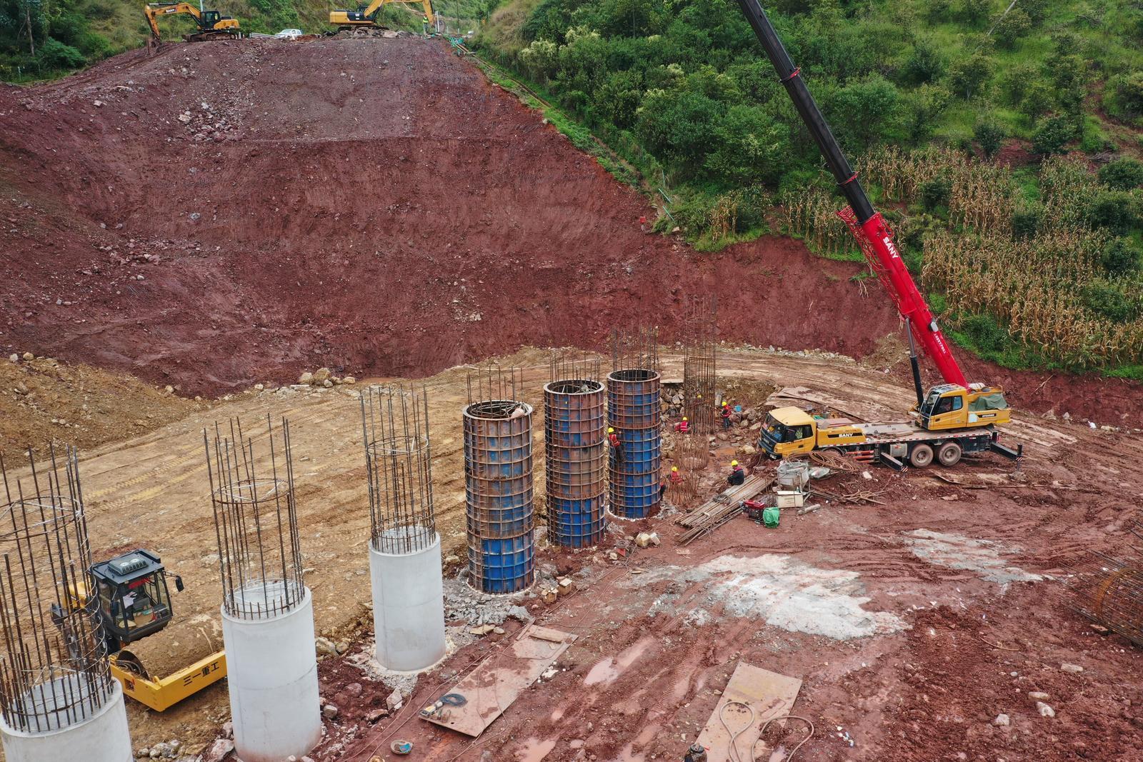 现场,有将近100米长的高速公路路基垮塌,在垮塌处,施工方已经打了13根抗滑桩,以稳固路基。在三四十米高度的不同作业面上,工人们正在忙碌,挖掘机、吊车等机械也正在忙碌作业。