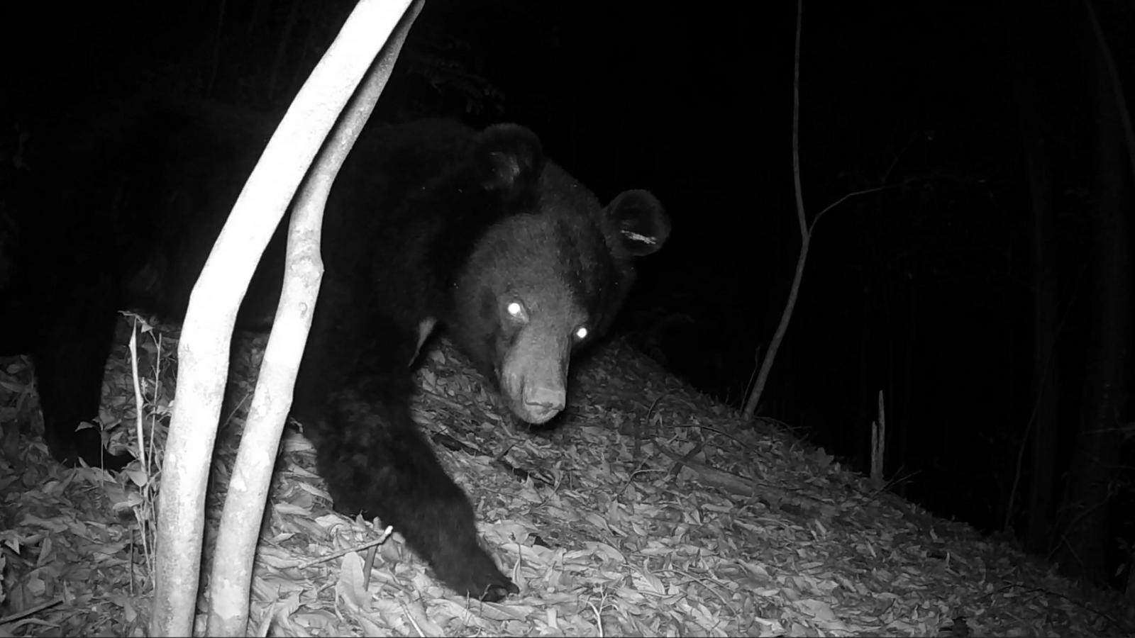 到了晚上,保护区成为各种野生动物的乐园。只见三只体型较大的成年中国豪猪睁着明晃晃的大眼睛从红外相机镜头前依次走过。红外相机还成功吸引了亚洲黑熊的注意,只见它在镜头前呆呆地看了一眼,然后走近镜头给自己拍了个美美的自拍,还好奇地舔了舔相机尝尝味道。