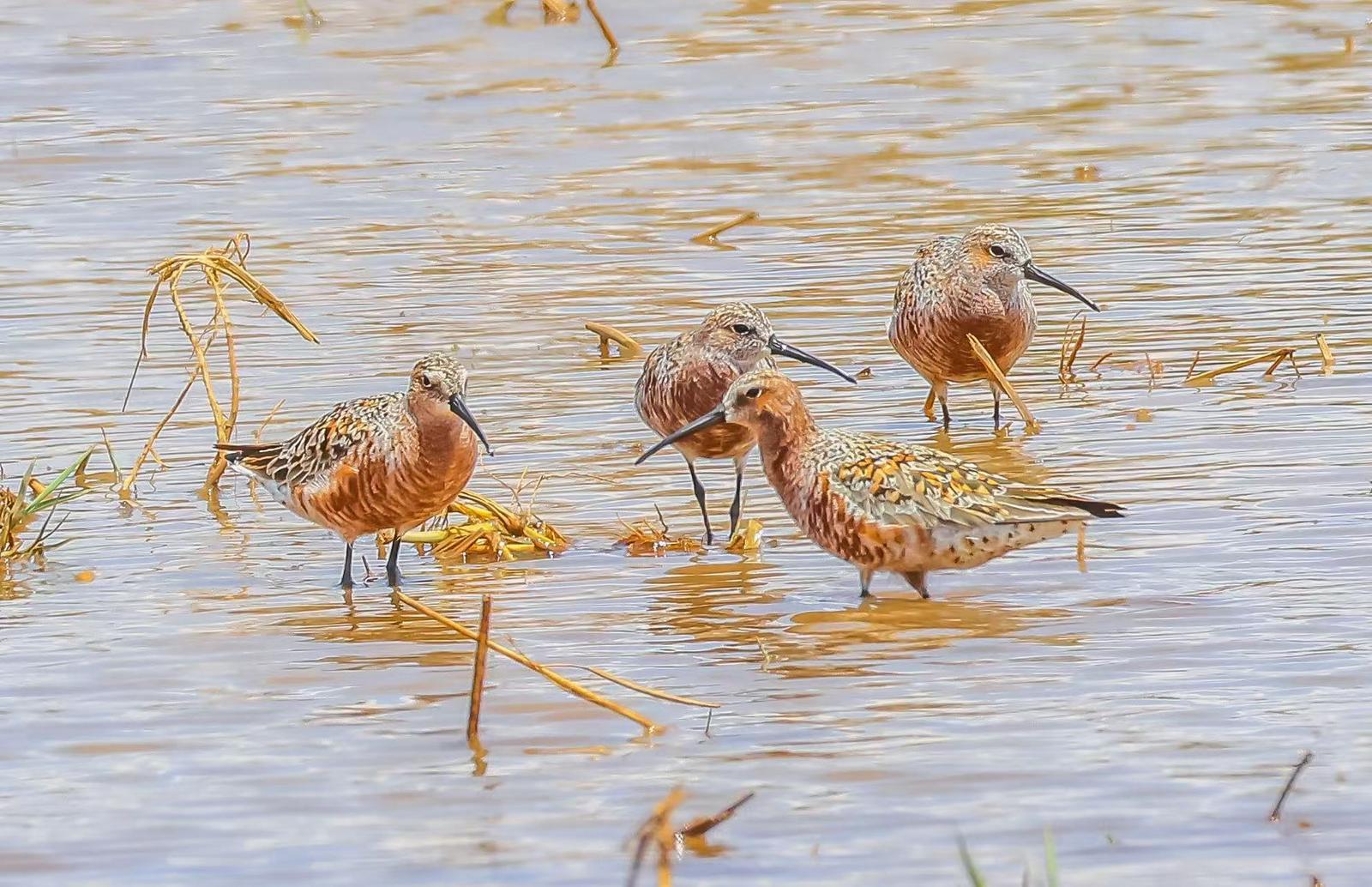 2024年4月在呈贡江尾村发现。弯嘴滨鹬是丘鹬科滨鹬属鸟类动物,小型涉禽,体长19—23厘米。嘴较细长,明显向下弯曲。夏羽头和下体栗色,上体黑色,具暗栗色和白色羽缘。飞翔时从上看白色腰和翼带极为醒目,从下看,翼下和尾下白色,其余下体红色,反差亦甚强烈。冬羽上体灰褐色,下体白色,颈侧和胸缀有黄褐色,眉纹白色。繁殖期主要栖息于西伯利亚北部海岸冻原地带,尤其喜欢在富有苔原植物和灌木的苔藓湿地。非繁殖期则主要栖息于海岸、湖泊、河流、海湾、河口和附近沼泽地带。