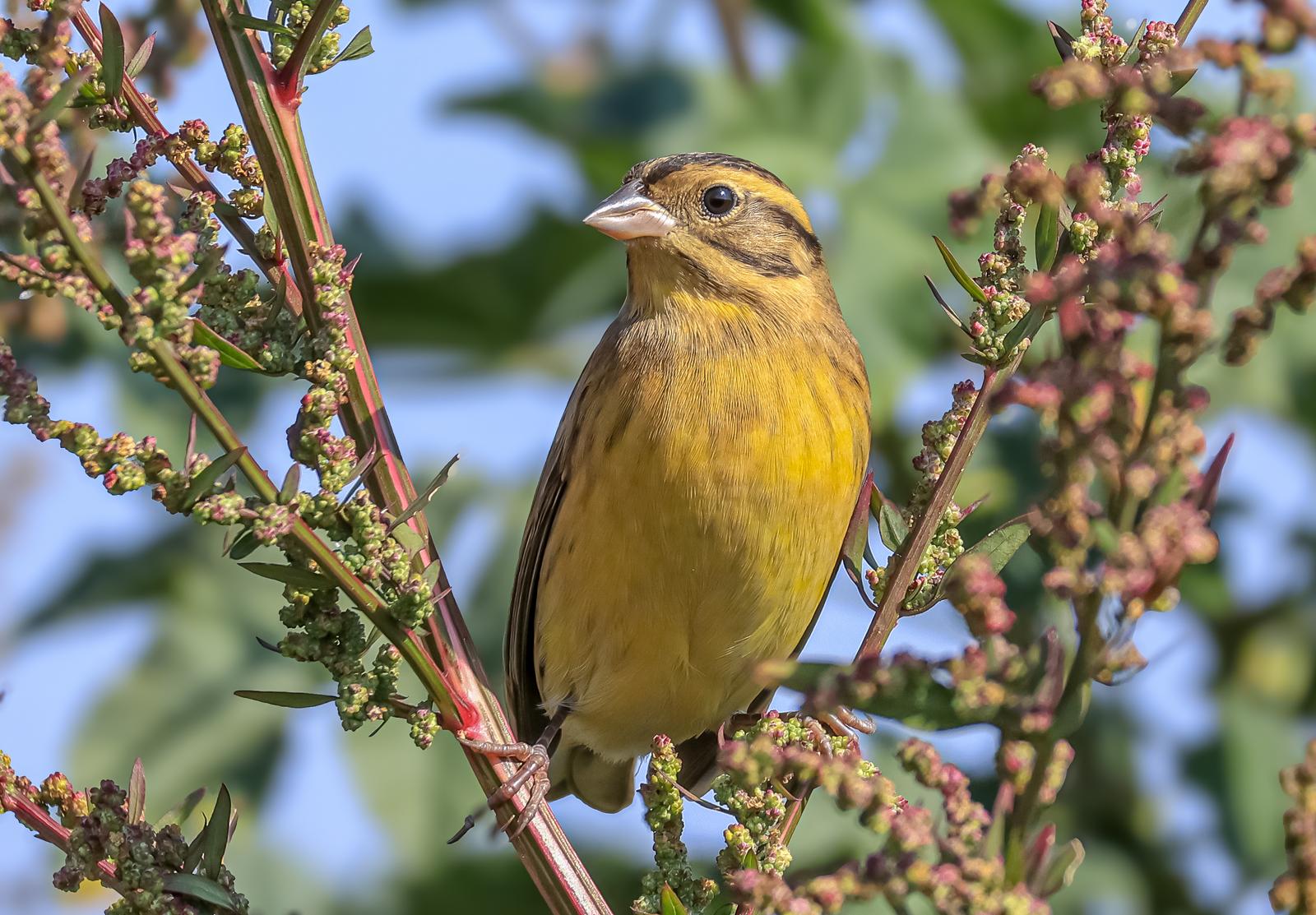 2024年9月在昆明福保湿地发现。黄胸鹀是雀形目雀科鹀属鸟类,又名黄胆、禾花雀。雄鸟额、头顶、颏、喉黑色,头顶和上体栗色或栗红色,尾黑褐色,外侧两对尾羽具长的楔状白斑,两翅黑褐色,翅上具一窄的白色横带和一宽的白色翅斑,下体鲜黄色,胸有一深栗色横带。雌鸟上体棕褐色或黄褐色,具粗著的黑褐色中央纵纹,腰和尾上覆羽栗红色,两翅和尾上覆羽黑褐色,中覆羽具宽阔的白色端斑,大覆羽具窄的灰褐色端斑亦形成两道淡色翅斑,眉纹皮黄白色,下体淡黄色,胸无横带,两胁具栗褐色纵纹。黄胸鹀广泛存在于欧洲、亚洲以及北美地区,在中国东北、新疆、华北、海南岛、台湾等地区也能看到其身影。栖息于低山丘陵至平原有稀疏树木的灌丛草甸,尤喜河谷湿地附近。繁殖期内单独或成对活动,繁殖期外成群活动,迁徙期间可形成数千只的大群。