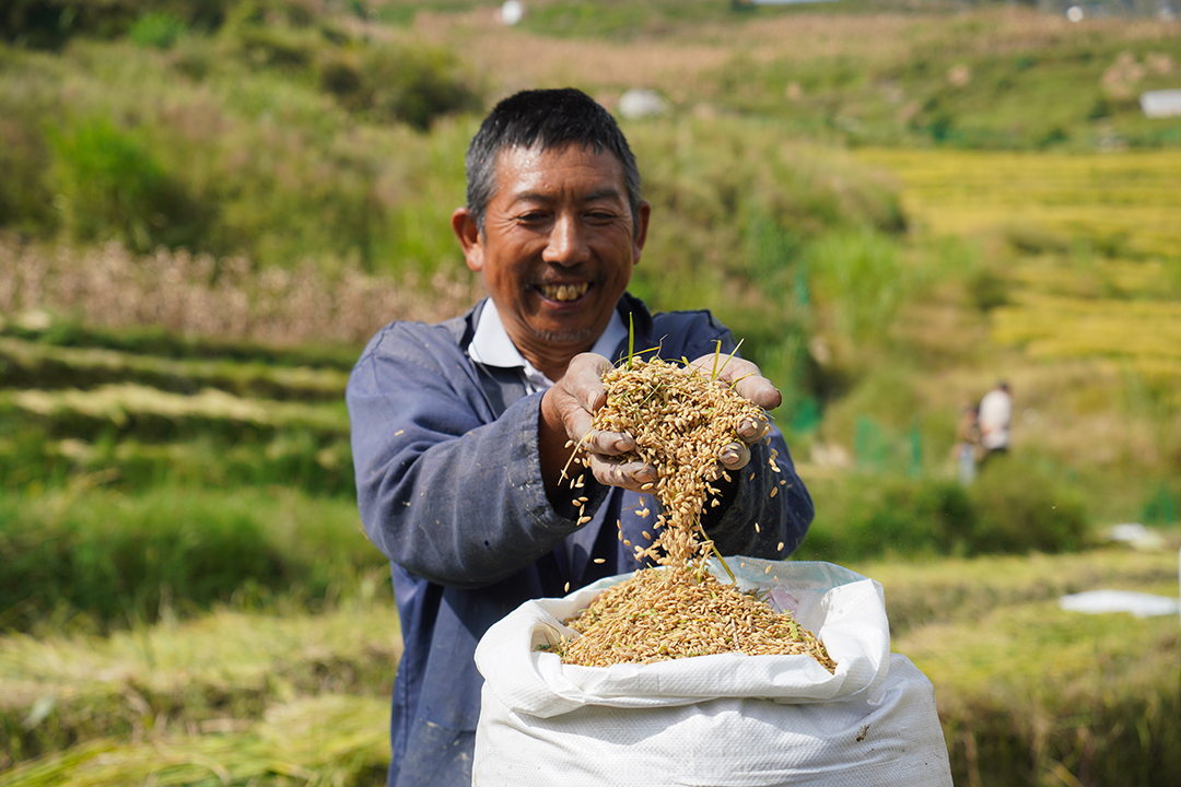 在金色的梯田里,正在忙碌的漭水镇河尾村阿背寨下寨村民小组村民于军古铜色的脸上挂满了汗珠,身后是映衬着蓝天远山的壮美梯田,辛勤的身影与天地融为一体。“今年是个好年景!你看这谷穗,多饱满!”老于抓起一把金黄的稻谷,乐呵呵地说,“我家在阿背寨,在这种了十年地,总面积是20亩,种的是优质稻,产量8吨左右,价格基本差不多,收入还可以。”