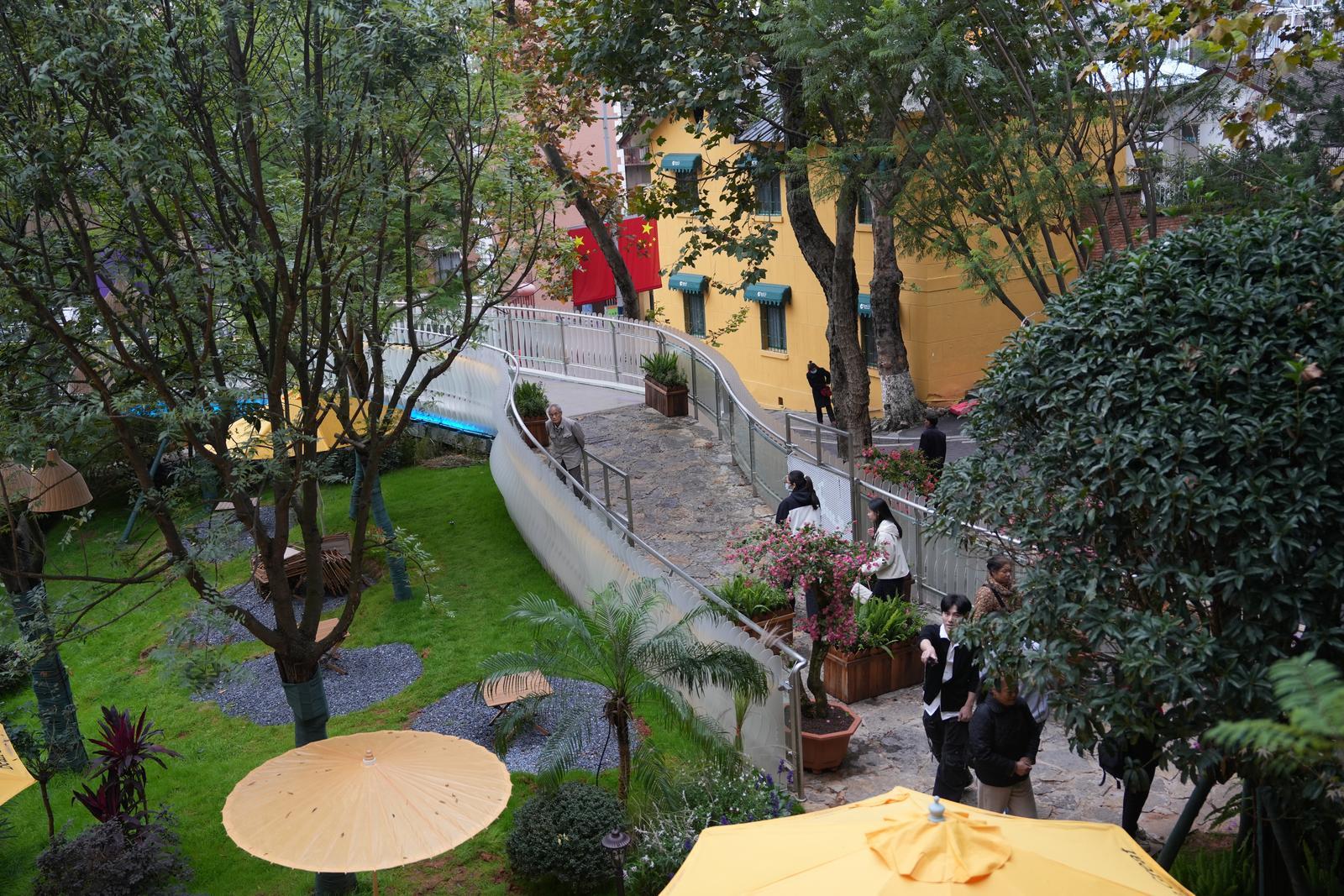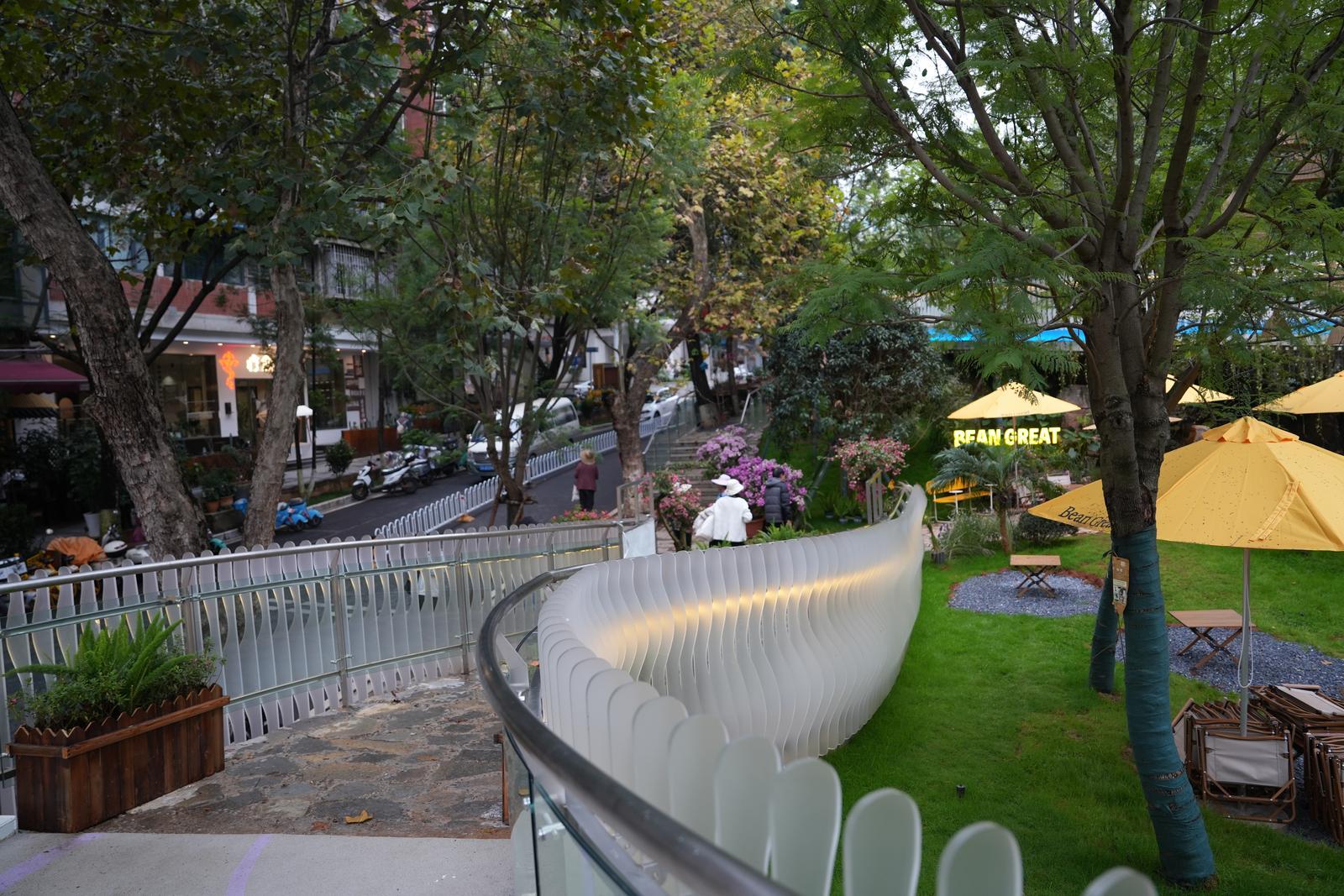 据了解,咖啡文化中心所在的黄公东街市政公园,是一座以历史文脉展示和文物建筑保护为核心的专类公园。设计过程中,项目团队尊重场地竖向特性,以传统园林手法恢复磨盘山景观意象,通过地形营造、植物造景,打造出环境清幽的城市山林。同时,依托公园绿地和服务建筑开展特色化场景活动,将公园打造为安全、舒适、美观、实用且具有包容性的公共空间,既扩展了公园绿地的服务范围,又提升了市民游客的体验感。在这里,你可以点一杯名为“翠湖煮酒”的特色咖啡,坐在紫伞下的吧台旁,看阳光透过树叶洒下斑驳光影,感受老时光与新日子的温柔邂逅。
