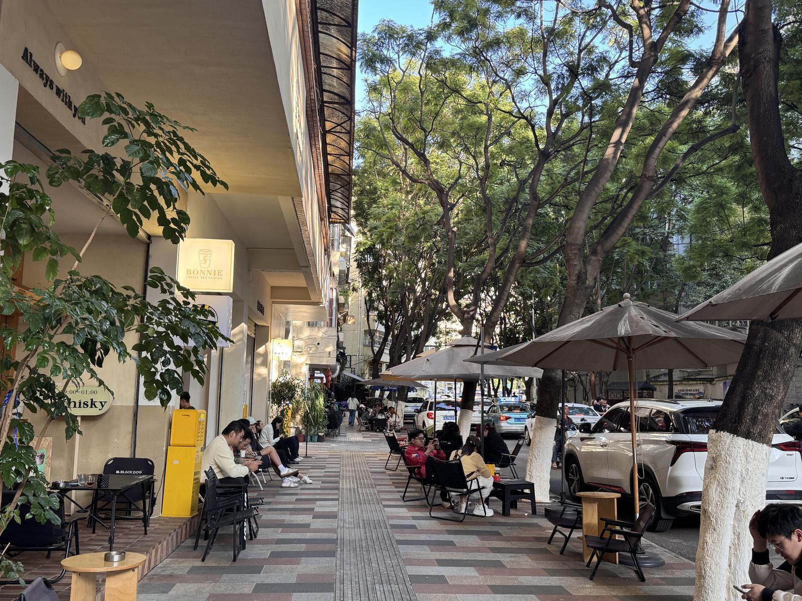近日气温回升,昆明的春日暖阳格外宜人,咖啡馆外的小桌、街边的台阶上,因此多了不少“临时座位”。许多人自带便携的钓鱼凳,坐在阳光下,手里捧着一杯云南本土手冲咖啡——有的源自普洱,有的产自保山,咖啡豆的香气融着阳光的暖意,在空气中缓缓飘散。