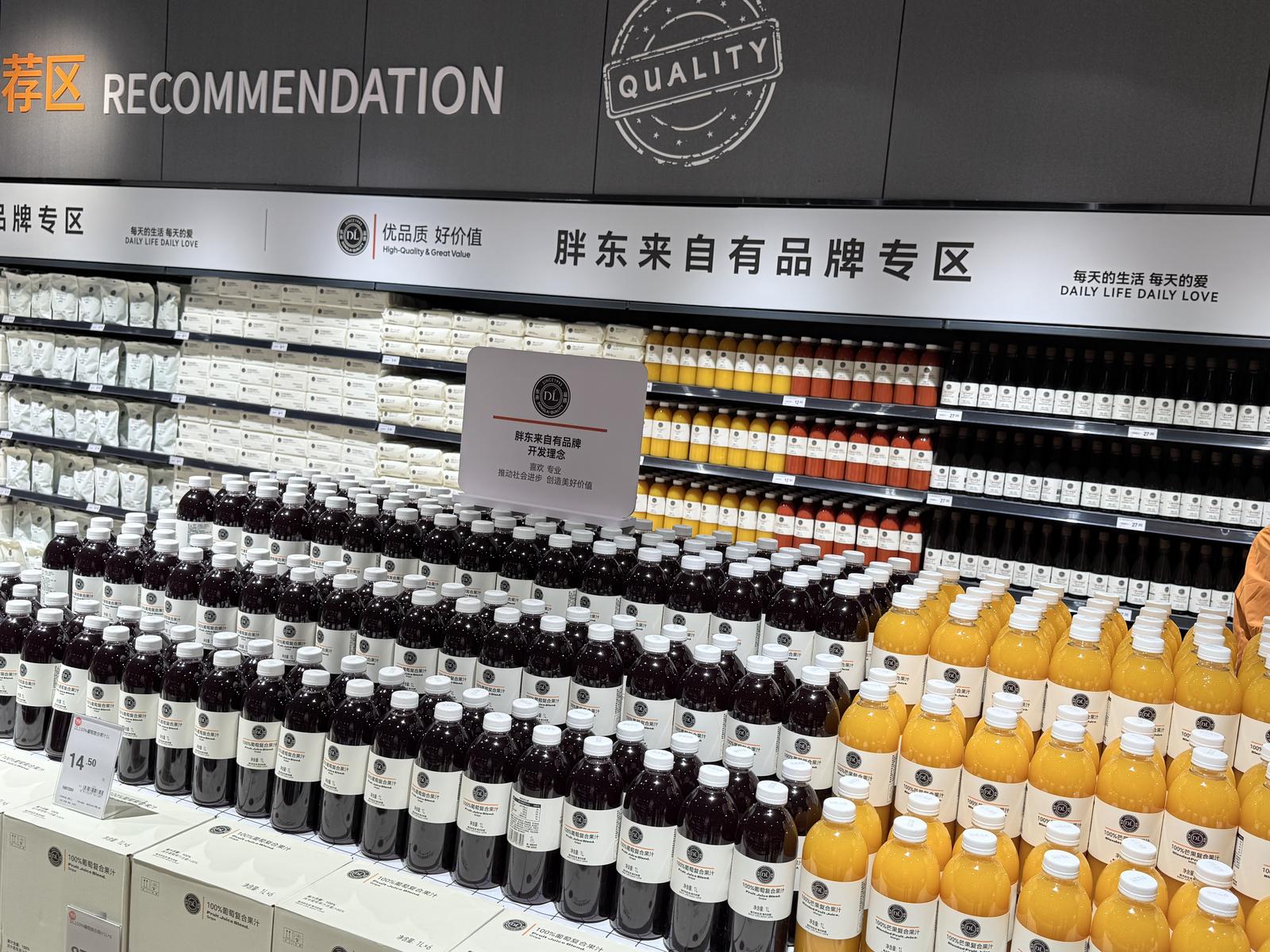 永辉超市云贵大区调改总教练霍华伟介绍,本次调改聚焦商品力重塑,核心目标是打造高体验感消费场景,让新城市民充分感受优质商品品质。门店商品结构达胖东来商品结构的80%,既引入71支胖东来同款畅销商品,涵盖DL啤酒、自由·爱白酒、DL果汁、DL燕麦片等品类,又强化永辉自有品牌“品质永辉”布局,头道特级生抽、东北长粒香大米等优质单品凭借严控品质与健康属性,持续赢得消费者信赖。同时,门店打造多款核心爆款商品,其中欧盟标准牛奶与伊利联合开发,售价仅7.9元,口感佳、品质优,为全国门店爆款,专设大陈列区;欧盟标准定制款原味酸奶售价9.9元,销量向好,同享优质陈列资源,品质优势突出且其他渠道难购得。低温奶板块同步升级优化,强化品牌差异化,精准满足新城当地顾客需求。此外,门店坚守“优质平价”策略,推出1.59元/公斤白萝卜、1.99元/公斤大白菜等惠民生鲜,红心火龙果、红富士苹果等水果平价供应,实现品质与性价比兼顾,契合新城市民日常消费需求。