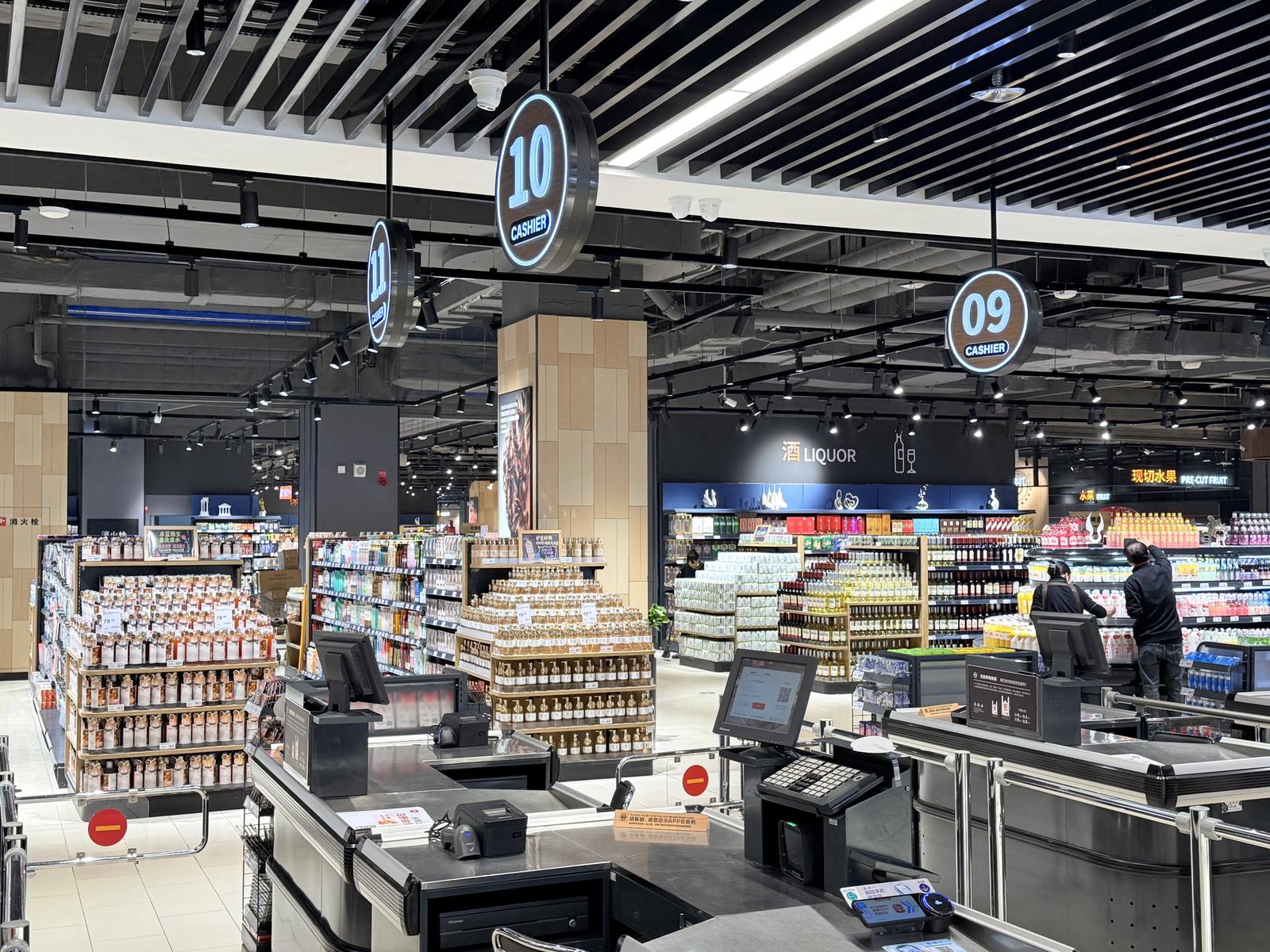购物环境与服务升级尽显人文关怀,贴合新城家庭消费、日常采购等多元场景。门店取消强制动线,货架高度统一降至1.6米,视野开阔更显舒适;收银台增至24台(含13台人工台、11台自助机),大幅提升结账效率,减少市民排队时长。细节服务遍布卖场,猪肉及水产区内专设顾客洗手池,适配摸肉、摸水产后的清洁需求,同时配备牙具、棉签、皮筋、发夹,方便市民整理仪容,搭配烘手器、纸巾,完善清洁配套;休息区配备一次性餐具、手套、身高体重测量仪、血压测量仪、视力投影仪等设备,还提供自助取冰、免费直饮水、5种茶饮及姜开水;肉禽柜台可切丝切片、海鲜柜台可剖鱼清洗、水果柜台按甜度为果切编号,深度加工服务全覆盖,节省市民处理食材时间。此外,医疗箱、爱心糖果、爱心轮椅、宠物寄存处与宠物饮水点同步增设,客服柜台推行“不满意就退货”政策,提供上门退换、易碎品打包、雨伞租借等多项便民服务,货架放大镜、连卷袋湿手器等小细节,尽显对消费者的细致考量。