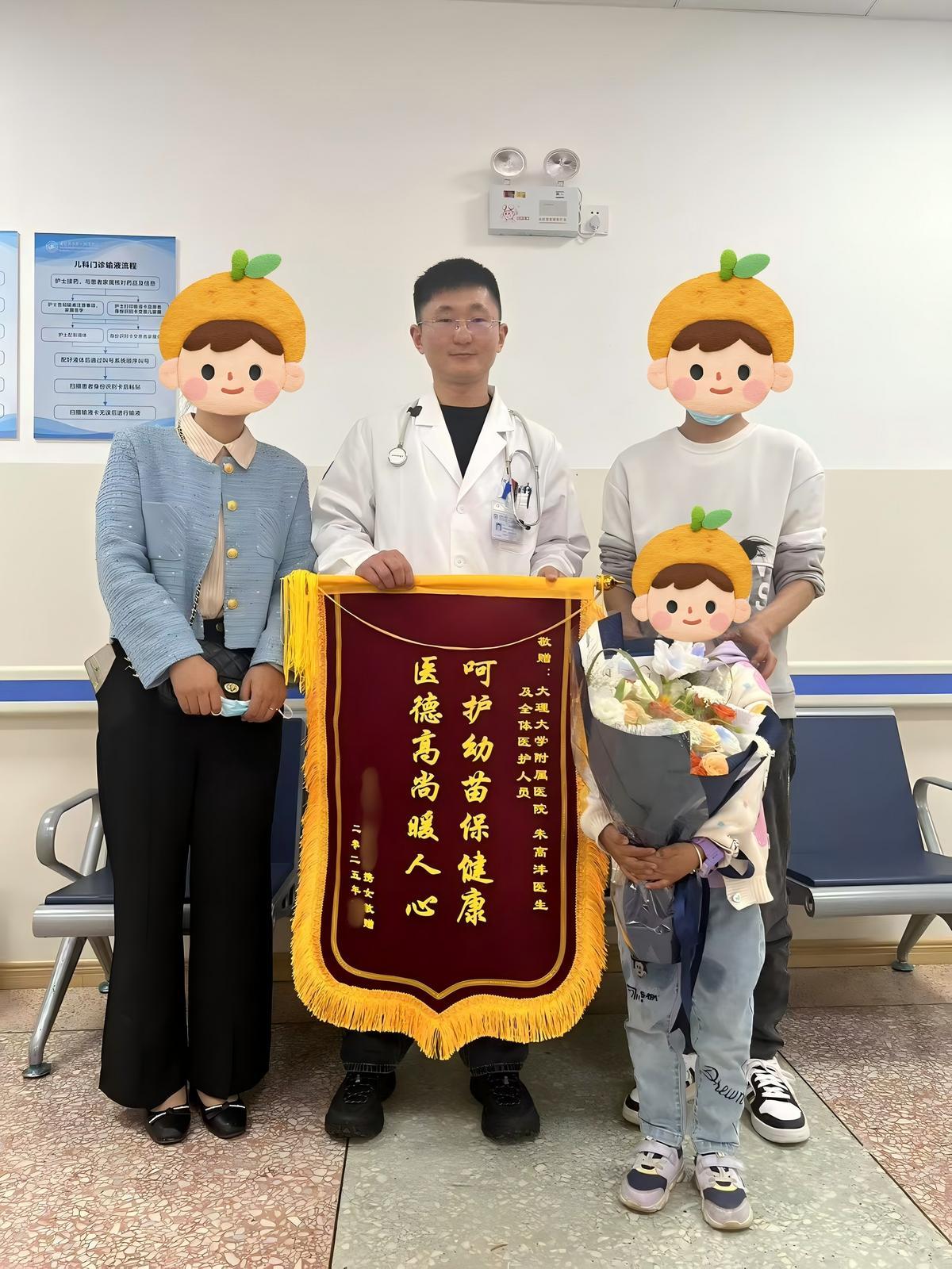 “很庆幸遇上您。”“您的回复,是我们慌张时的‘镇静剂’。”近日,在大理大学第一附属医院儿科,一对夫妻将锦旗送到朱高沣医生手中。锦旗上写着:“呵护幼苗保健康 医德高尚暖人心”。