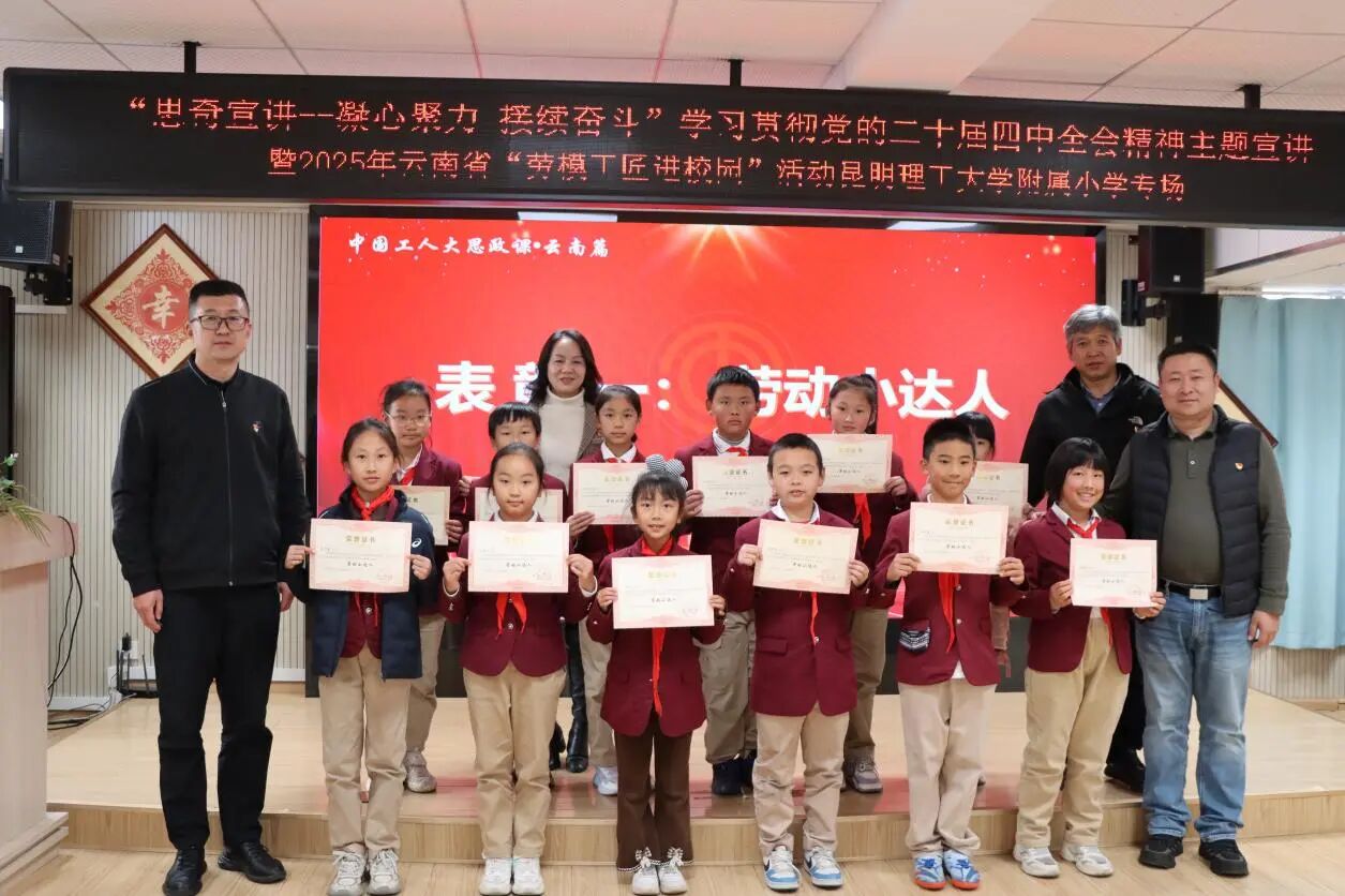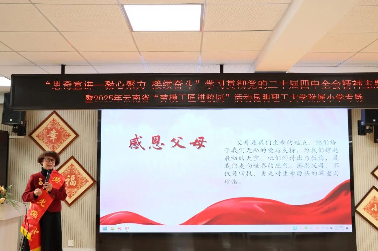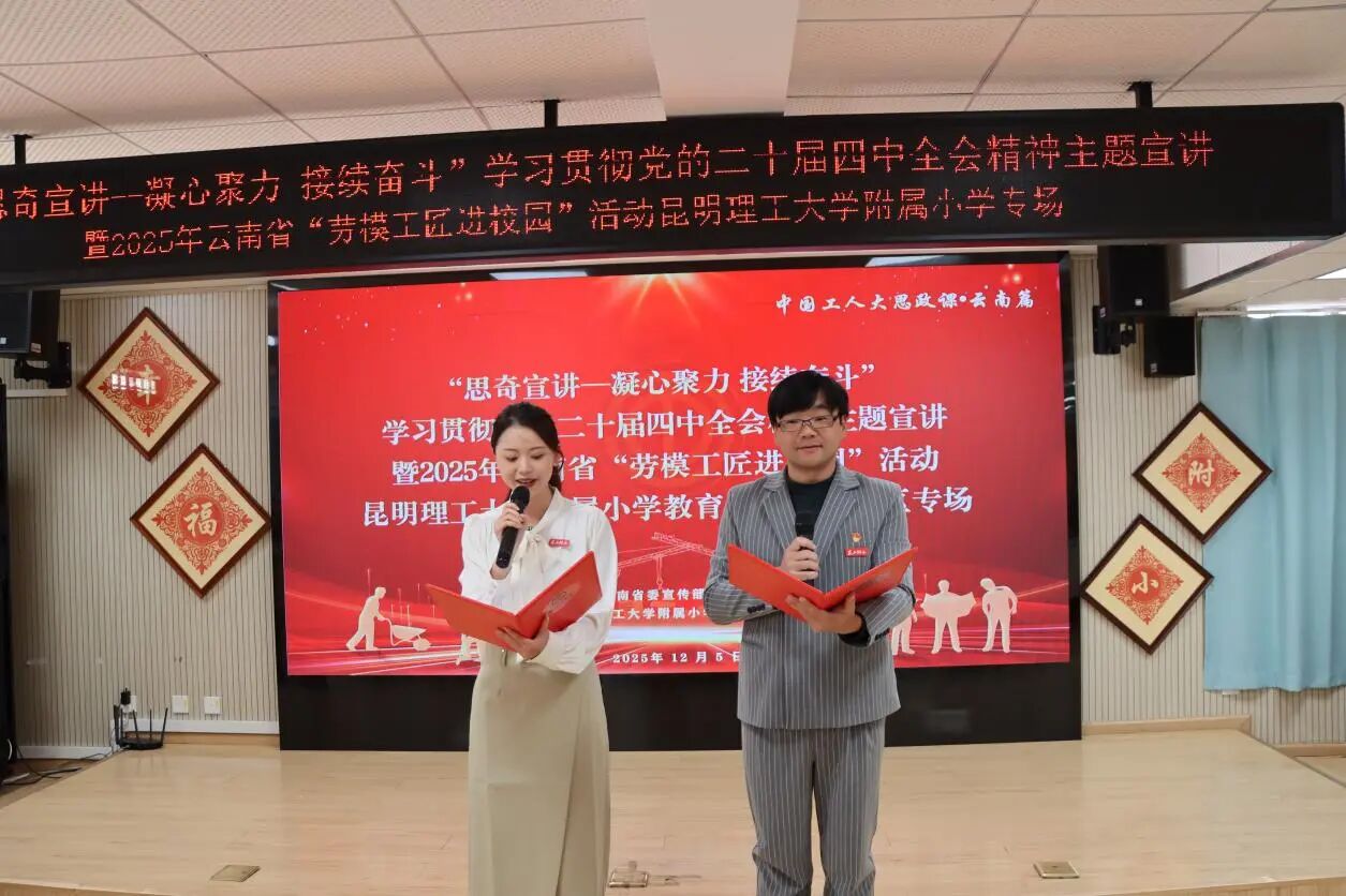 2025年12月5日,“思齐宣讲——凝心聚力 接续奋斗——学习贯彻党的二十届四中全会精神”主题宣讲暨云南省2025年“劳模工匠进校园”活动,在昆明理工大学附属小学教育集团莲华校区举行。活动由中共云南省委宣传部、云南省总工会联合主办,百余位师生和家长代表参与。