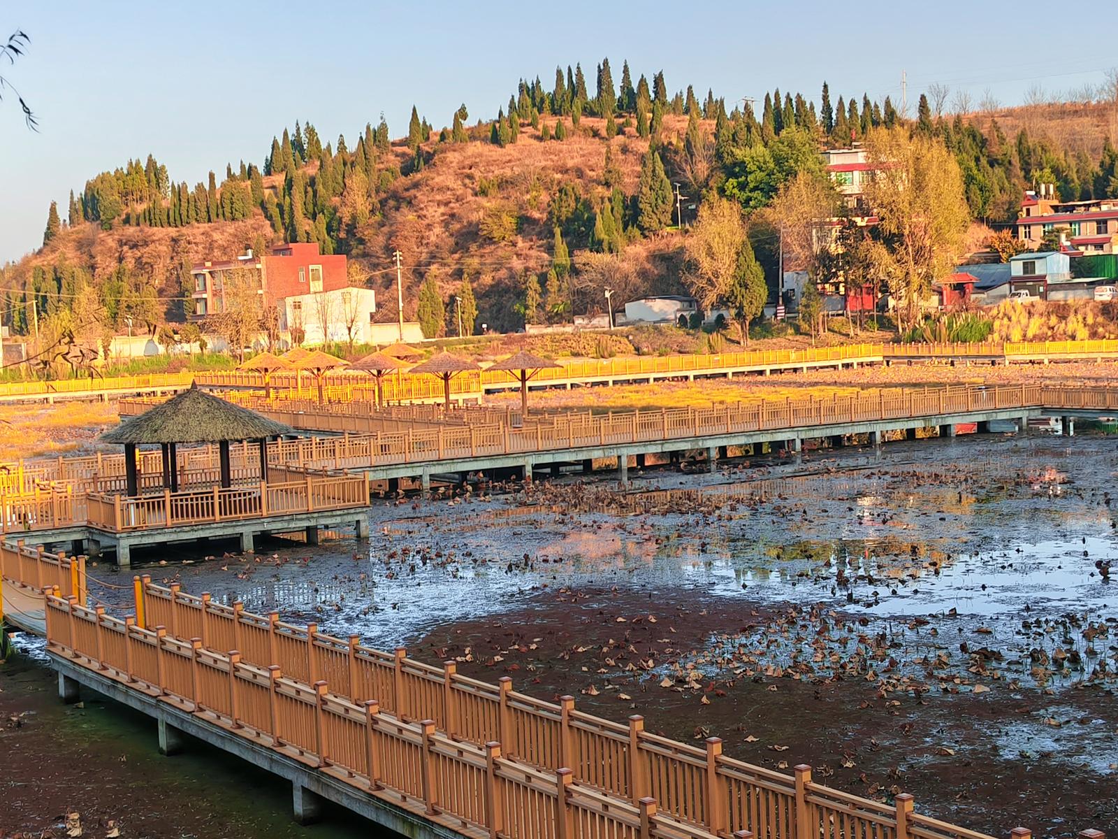 时下,走进宣威市来宾街道的虎头山·云间红长征文化公园,空气中透着暖意。荷塘虽已敛去夏日的繁盛,却显得格外沉静。晚霞为水面披上金纱,偶有白鹭翩跹掠过。游客们或漫步于红军村与亲水栈道,聆听红色故事;或坐在“忆往昔”咖啡馆里,手捧醇香的榛果拿铁,于安宁中回望烽火岁月。