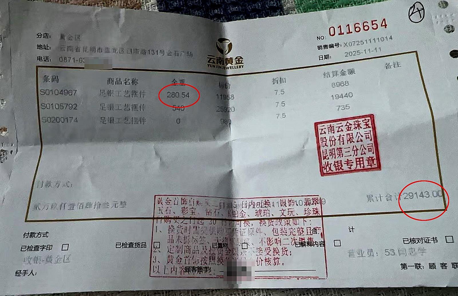 今年11月11日,家住昆明北市区的唐女士经朋友推荐,来到金石广场的“云南黄金”门店,打算为七十多岁的老母亲选购一份寿礼。时值“双十一”,该线下门店也推出了七五折优惠活动。唐女士看中了一件标价为11958元的999足银工艺摆件银碗,其标签注明重量为280.54克,折后仅需8968元。
