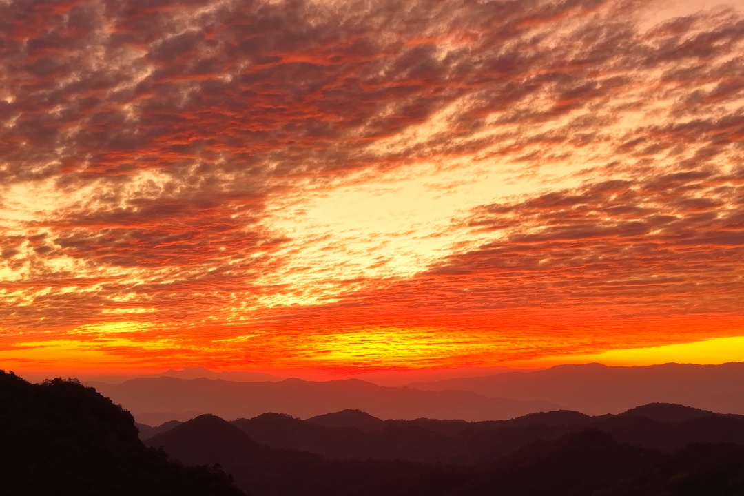 随着暮色渐浓,晚霞的色彩开始层层递进。橘红渐渐褪去,玫粉与绛紫接踵而至,将天空晕染成一幅流动的油画。云朵被撕扯成细碎的模样,有的如轻纱飘浮,有的似棉絮堆叠,光影在云层间穿梭,明暗交错间,连远处的山峦都化作朦胧的剪影。昌宁的晚霞从不会吝啬它的层次,浅紫、深绯、鹅黄……各色光影在天际碰撞、融合,最终化作一片温柔的暮色,将茶山、村寨轻轻拥入怀中。
