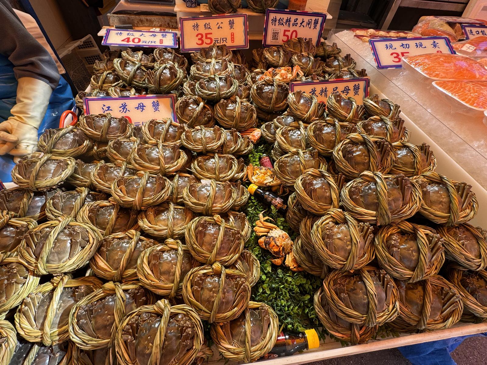 在篆新农贸市场,水产区的大闸蟹个个青背白肚、活力十足,让人眼前一亮。母蟹圆脐凸起坚硬,掰开后蟹黄宛如凝脂;公蟹尖脐鼓胀充实,蟹膏晶莹黏糯。随手拿起一只,捏蟹腿硬实不软,掂着沉甸甸满是分量。