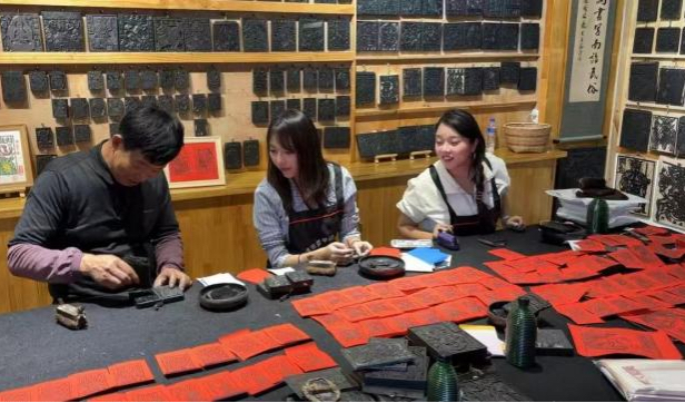 推开传习馆的大门,墨水清香与手工纸的质朴气息交织,墙上、架上整齐摆放着1000多种雕版,既有“水草大王”等传统祈福纹样,也有网红打卡点、地方文物等创新题材,甚至还有“哪吒”“摆烂悟空”这类贴合年轻审美的图样。