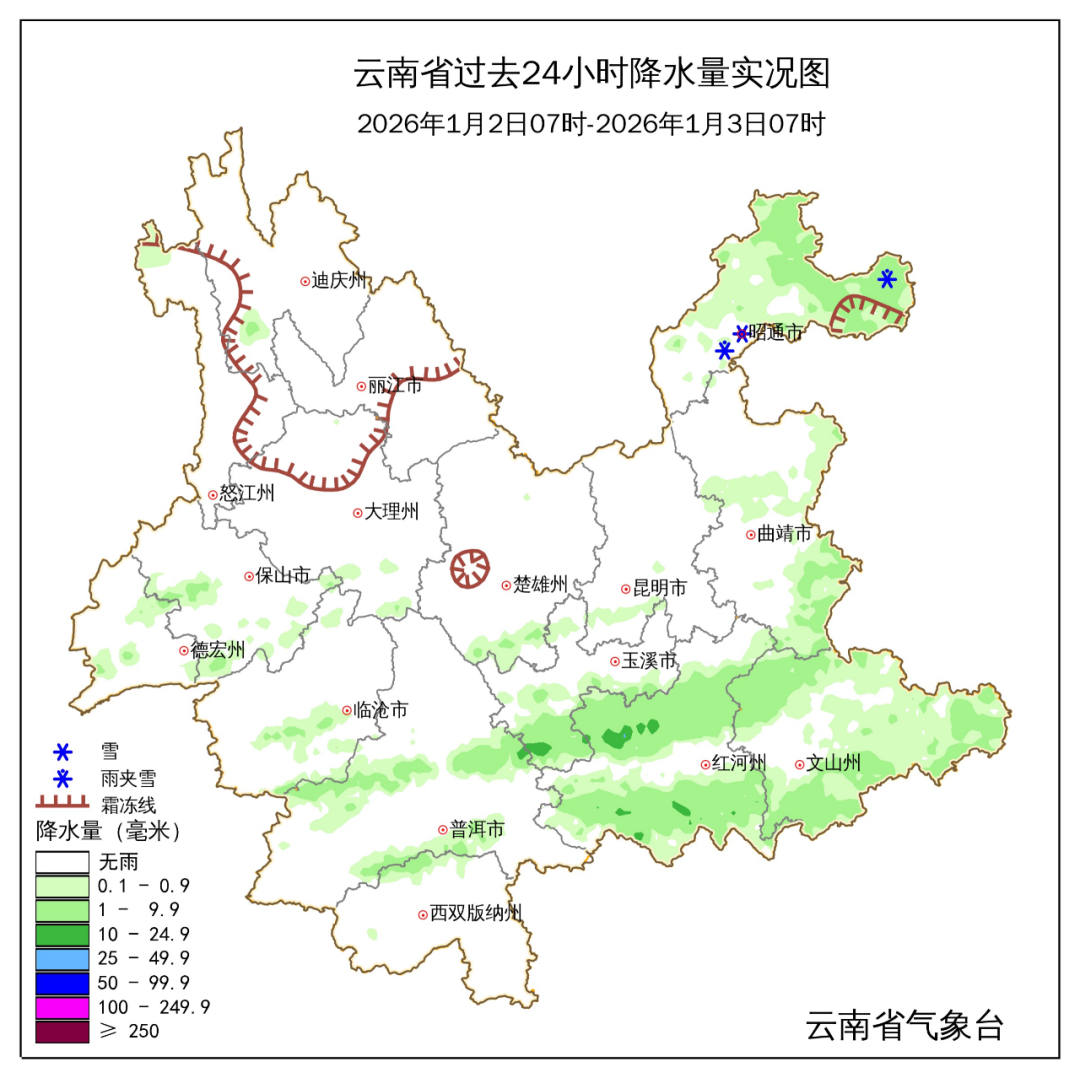 1月2日,昭通市北部、曲靖市东部、文山州、红河州、玉溪市南部、昆明市南部、楚雄州南部、普洱市中南部、临沧市南部、保山市南部出现小雨局部中雨、大雨,其中昭阳区、鲁甸县、威信县出现小雪或雨夹雪,其他地区晴间多云。东部地区持续受冷空气影响,最高气温下降2~6℃。